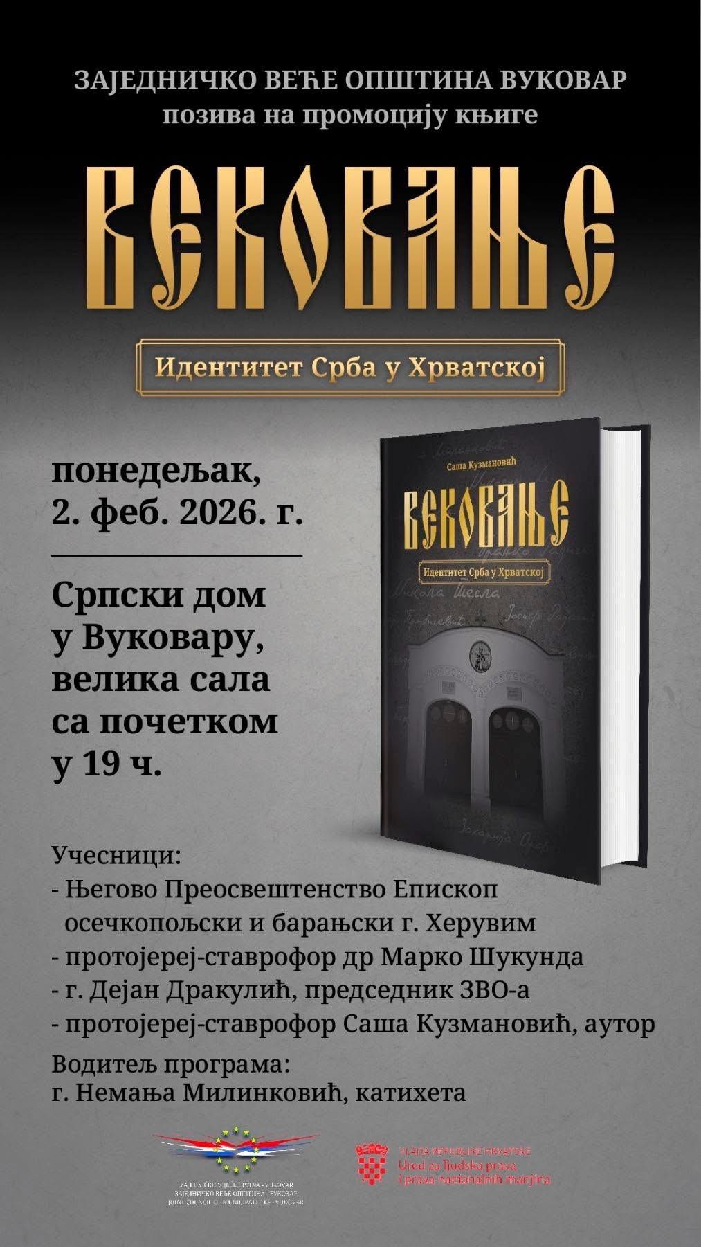 Заједничко веће општина Вуковар организује промоцију књиге „Вековање – Идентитет Срба у Хрватској“, аутора протојереја-ставрофора Саше Кузмановића. Промоција ће бити одржана у понедељак, 2. фебруара 2026. године, у Српском дому у Вуковару, на адреси Еуропске уније 5, са почетком у 19.00 часова.У програму промоције учествоваће Његово Преосвештенство Епископ осечкопољски и барањски г. Херувим, протојереј-ставрофор др Марко Шукунда, председник Заједничког већа општина Вуковар Дејан Дракулић и аутор књиге, протојереј-ставрофор Саша Кузмановић. Програм ће водити катихета Немања Милинковић